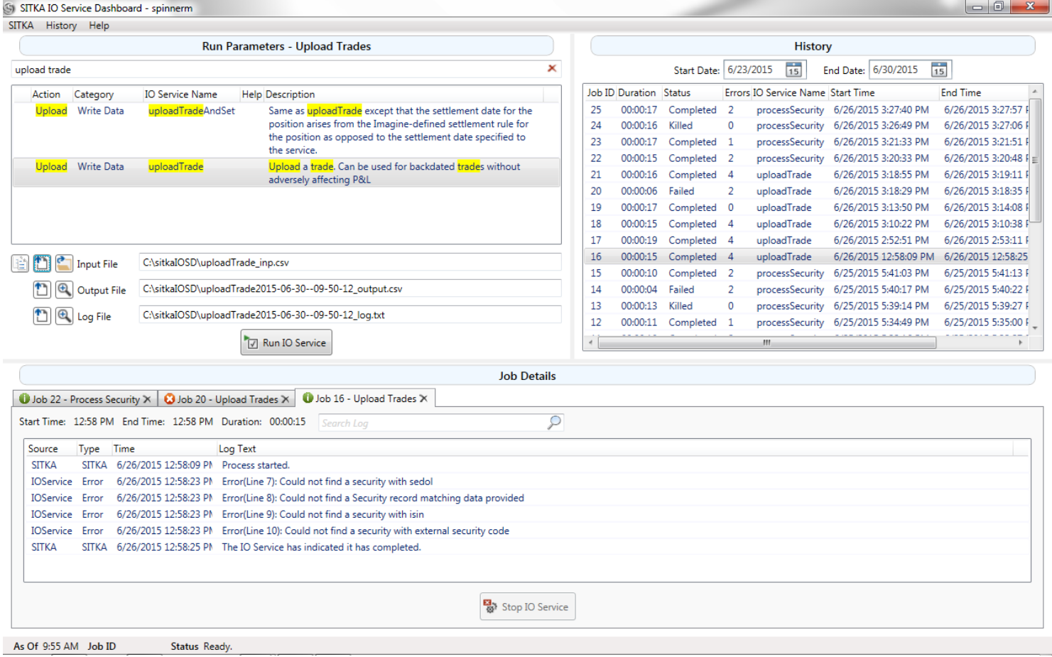 It is a one-stop command center for running, monitoring, and reviewing results of I/O Services jobs. It is powerful, lets you come away from viewing the long and somewhat tedious batch files, and gives you a tool for setting up jobs and monitoring them. A partner of TS Imagine, Sindex Financial Systems, wrote this dashboard management program for our I/O Services.