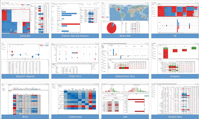 Click here for a closer look at dashboards like these and others built for P&L and performance, exposure analysis, stress testing, FX, VaR, Greeks, beta & correlation, and more.