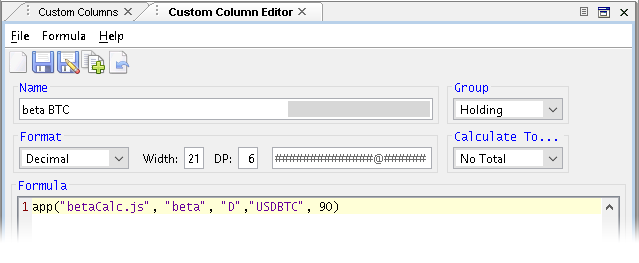 The customized beta calculation can be displayed as a standalone portfolio column, or incorporated into more advanced custom calculation columns, as shown below.