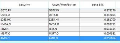 TS Imagine’s constantly-expanding data offering allows investors to access historical prices of the bitcoin cryptocurrency (using the symbol USDBTC). With this data, investors track the relationship between holdings and bitcoin using a historical price time series of a portfolio containing holdings with cryptocurrency exposure. They then create a custom calculation (custom column) to calculate beta between the daily, weekly, and monthly price of each holding, and that of USDBTC within a certain time frame, e.g., 90/180/365 days.