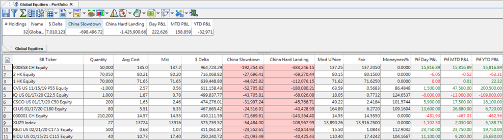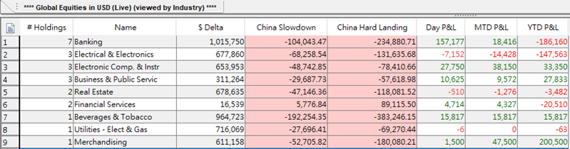 In addition to viewing position-by-position results and portfolio totals, you can aggregate positions by parameters such as Industry or Currency to display meaningful breakdowns of the stress-test results.