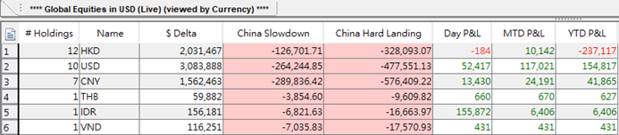 The scenarios below attempt to capture the potential impact of either a moderate slowdown or hard landing for the Chinese economy on select asset classes, incorporating both a risk-off sentiment towards Chinese equities and risk assets as well as a flight to safety towards the US dollar, US treasuries and gold.