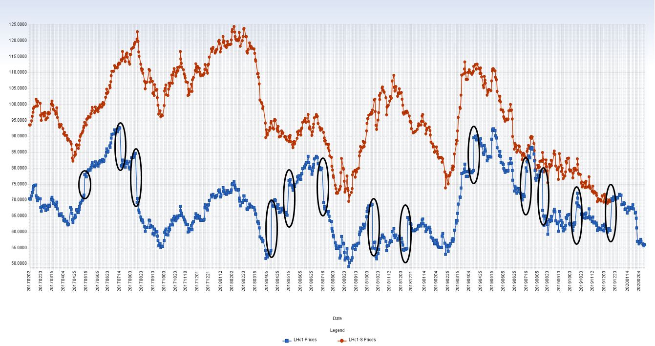 The effect is stark. Note that significant jumps in the blue time series due to the rolling of contracts have been adjusted (most significant roll dates circled), while the actual fluctuations in price remain represented. This provides more consistent and accurate realized volatility calculations and accurate correlations between continuity symbols.