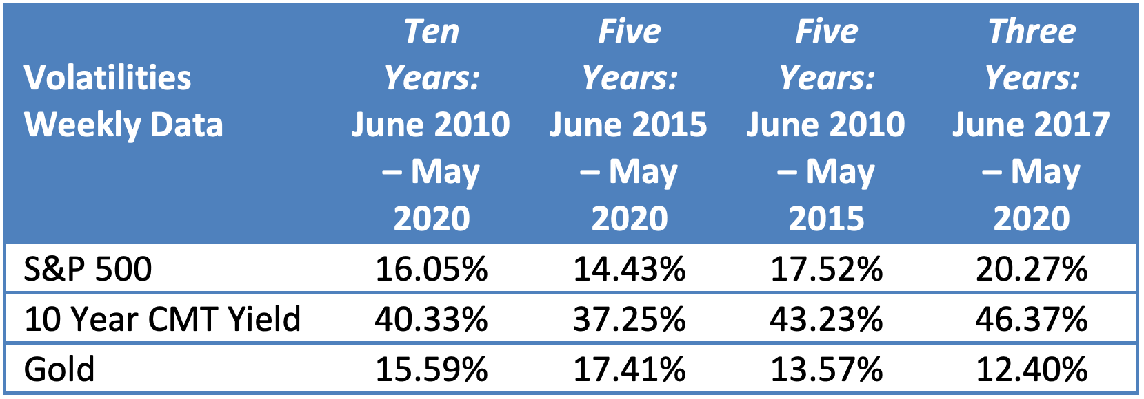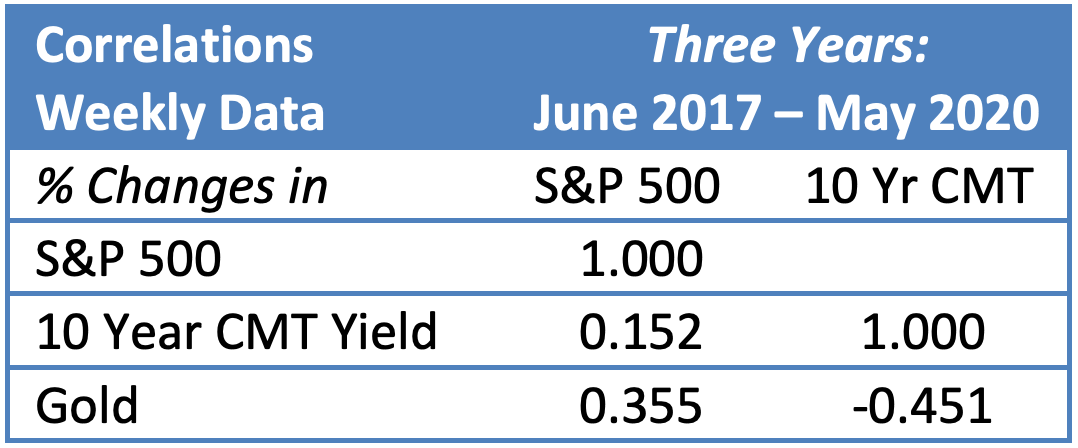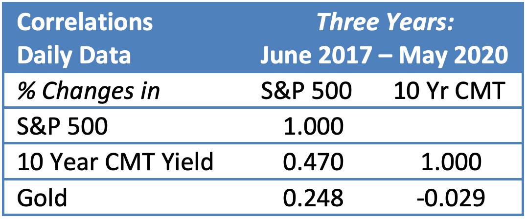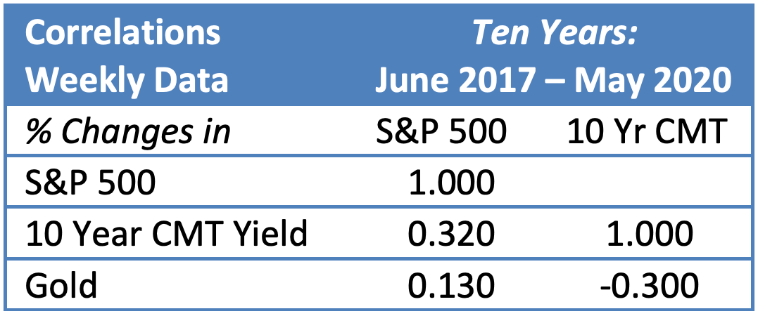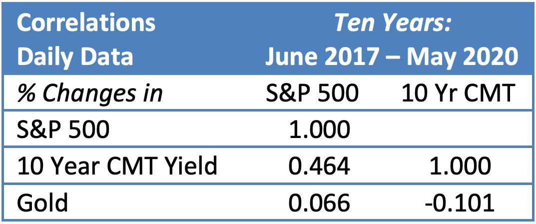 To keep things simple we focus on only three asset classes, but the principles apply to every type of investable asset. We use (1) large cap U.S. equities, specifically the S&P 500, (2) interest rates, represented by the yield of the U.S. 10-year constant maturity (CMT), and (3) gold, specifically the 3 pm London fixing in USD. We use 10 years of data, from June 2010 through May 2020.